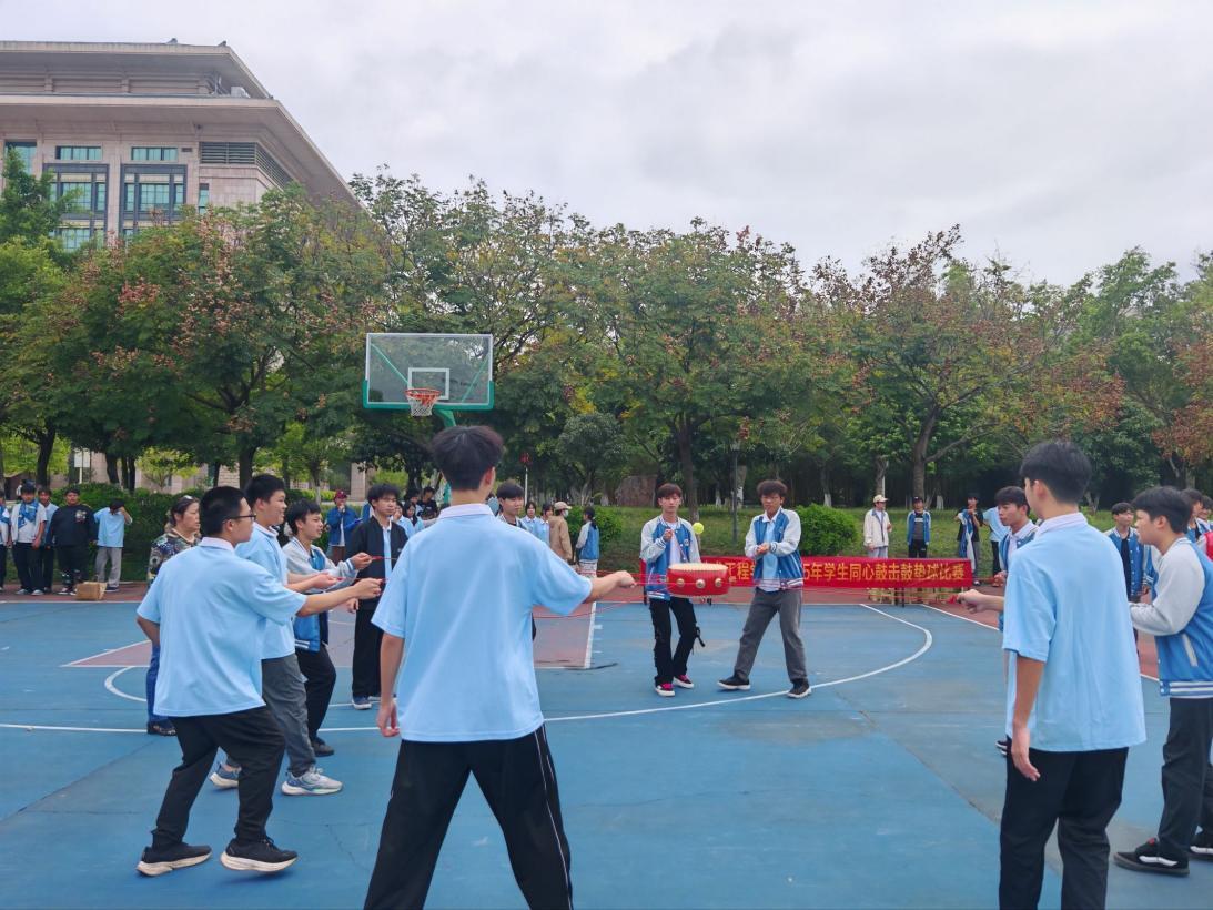 同心鼓比赛需要多人协作完成,每班派出11人组成参赛队,在5分钟内垫球次数最多的队获胜;若中途球落地,则需从零重新计数,连续垫球次数最多的一次为该队最后的有效比赛成绩。此项比赛不仅考验学生对团队节奏的精准把控、队员间的默契配合,更考验大家的耐心调整能力与专注投入定力。