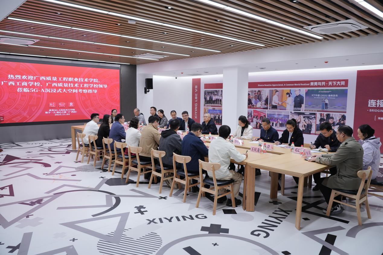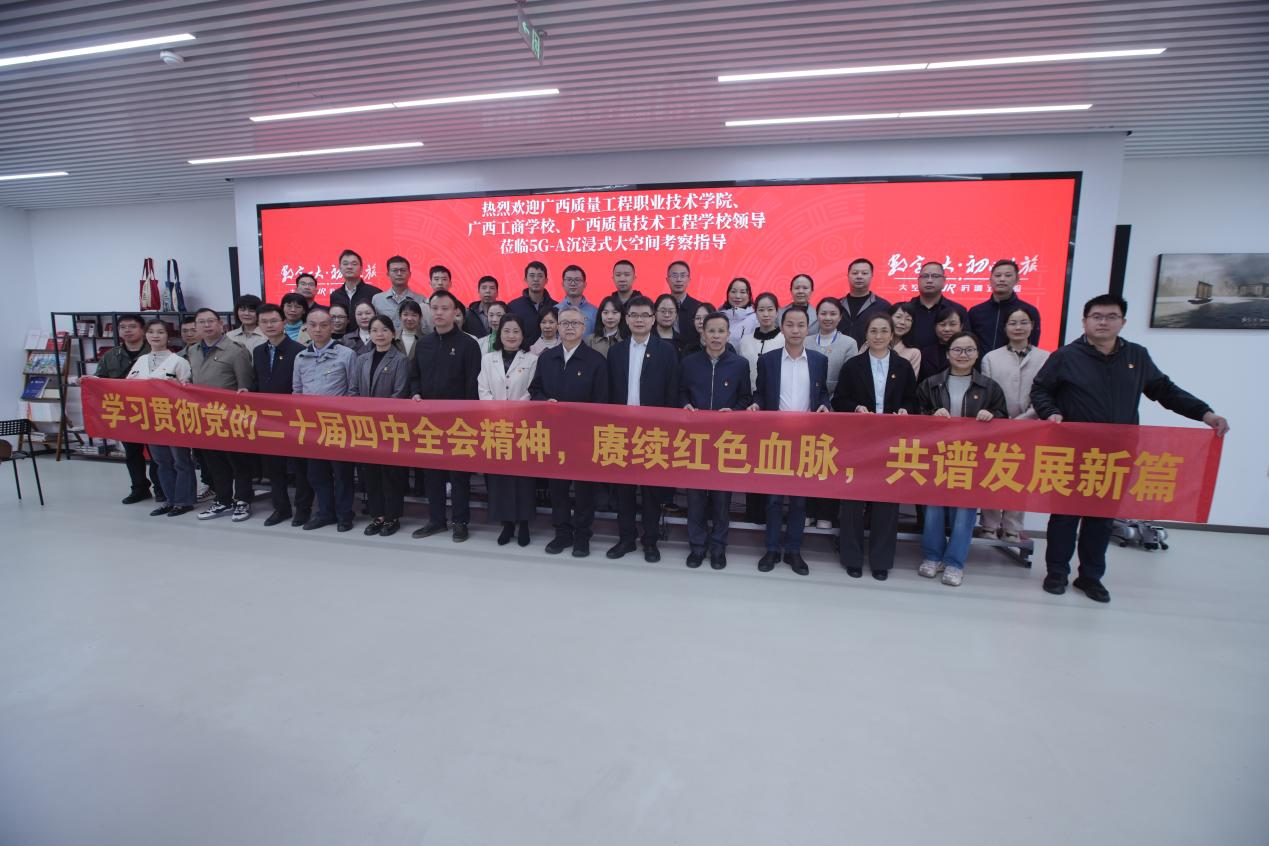 为深入学习贯彻党的二十届四中全会精神,进一步凝聚共识、推动发展,11月4日上午,广西质量技术工程学校党员代表赴茜英5G-A沉浸式大空间展馆,与广西质量工程职业技术学院、广西工商学校、广西茜英信息技术有限公司联合开展“赓续红色血脉,共谱发展新篇”主题党日活动。